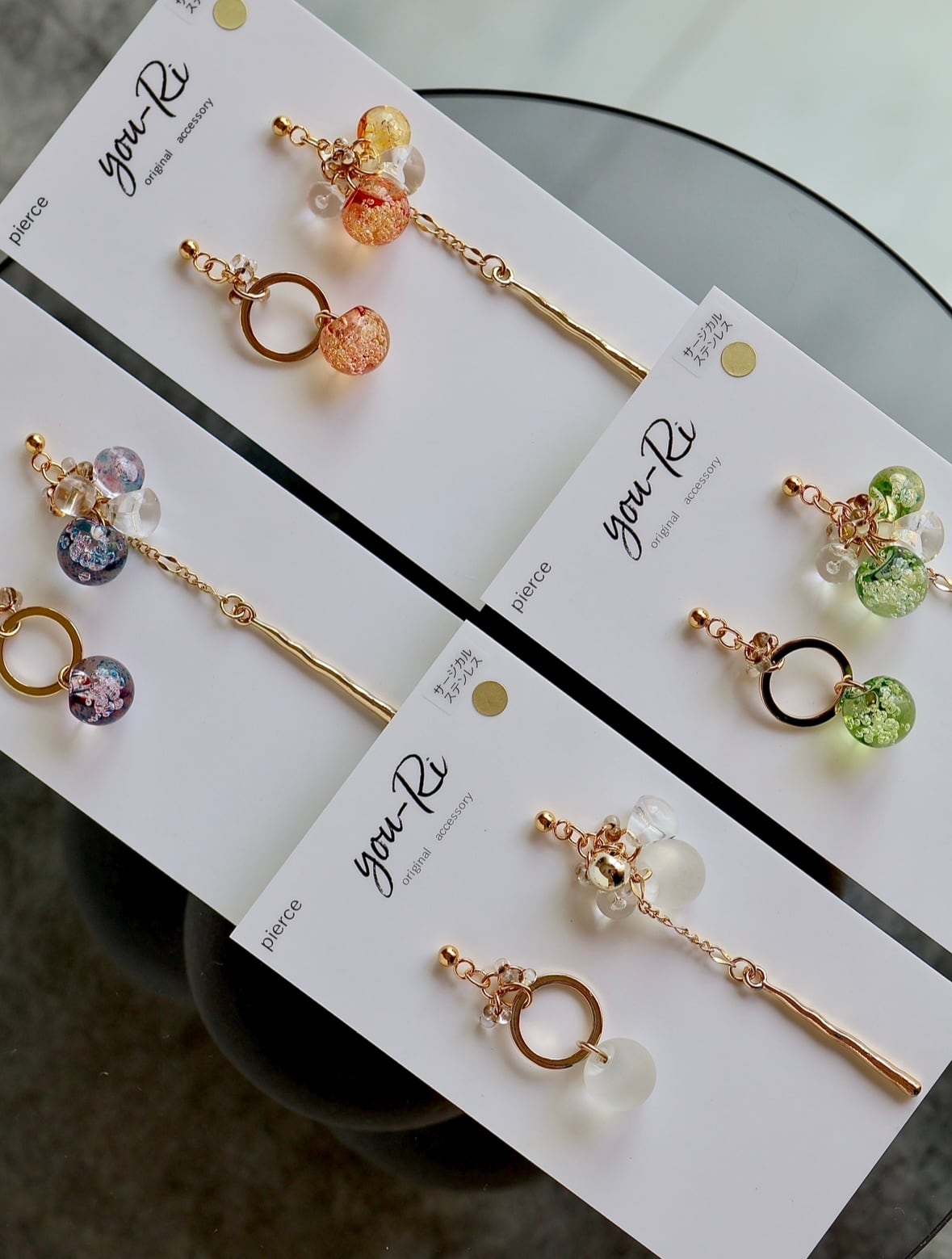 鈴丸ビーズ×しゃぼん玉のアクセサリーです。 しゃぼん玉のサイズは16mmとなっています。 鈴丸に水入りのしゃぼん玉をつけました。 全長約33mm 重さ…片耳約3g